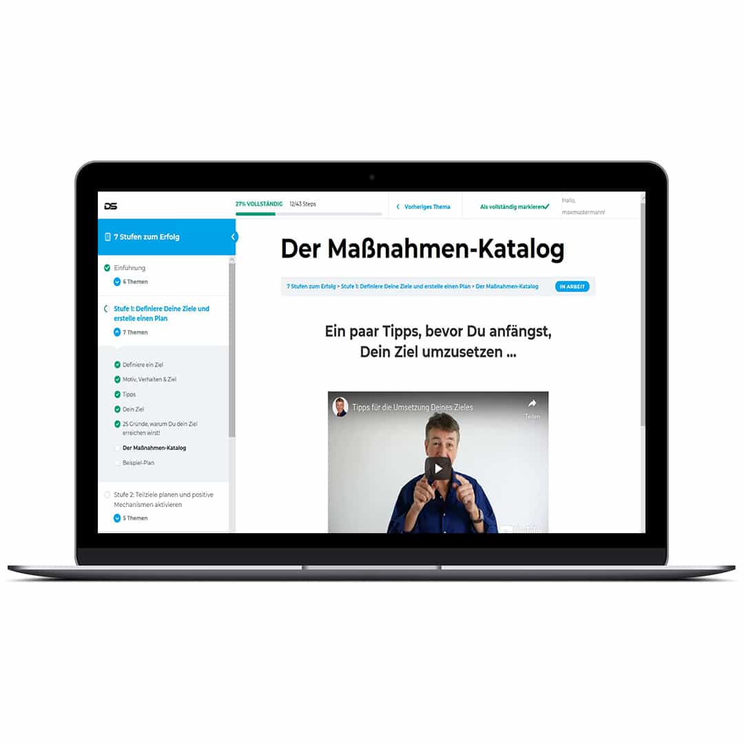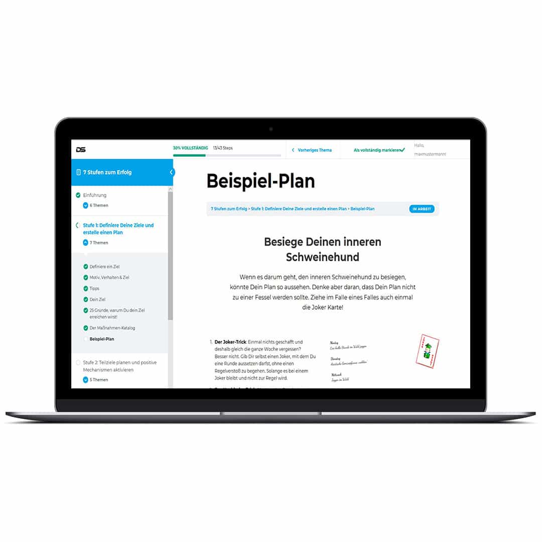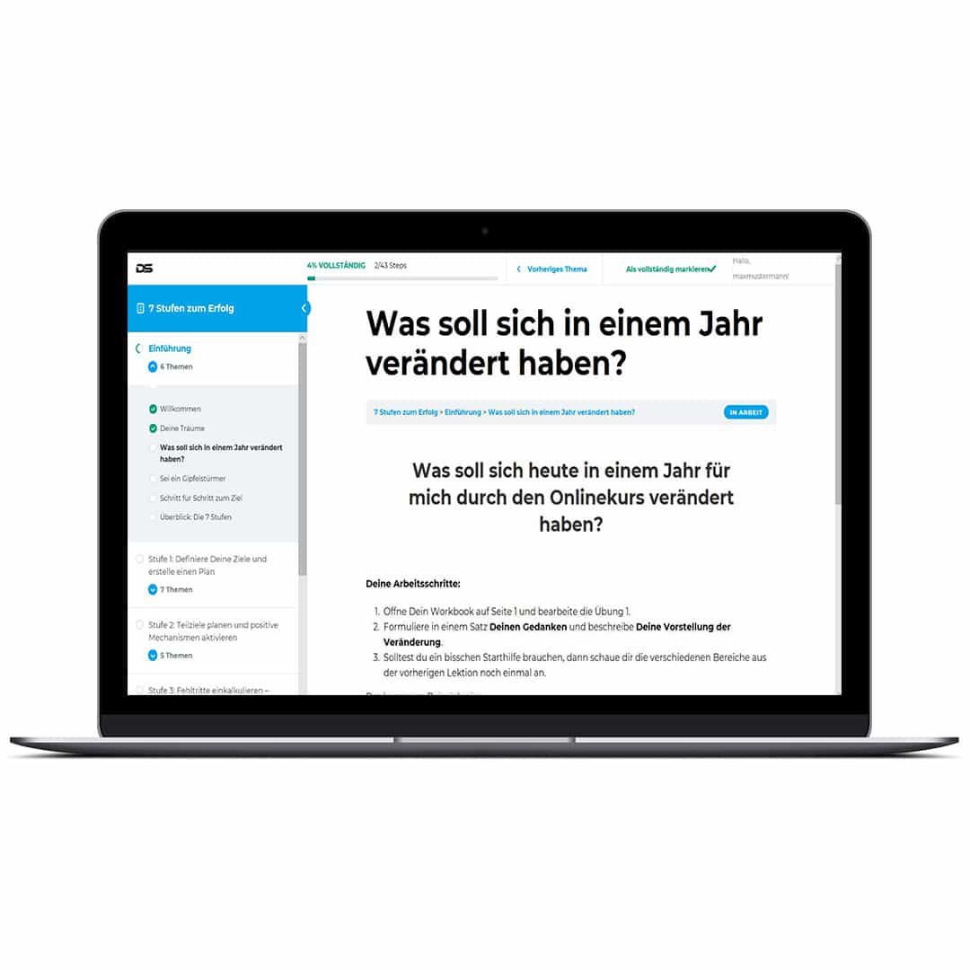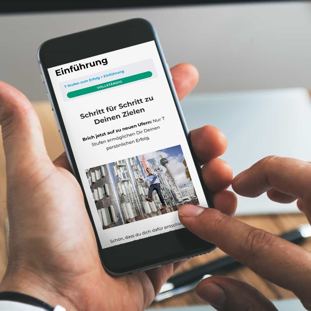 Du kannst jederzeit auf die Inhalte zugreifen, deinen Fortschritt messen oder eine Stufe zurückgehen, wenn dir neue Ideen kommen. So wird der Onlinekurs „7 Stufen zu deinem persönlichen Erfolg“ zu deinem persönlichen Tagebuch für die Transformation.