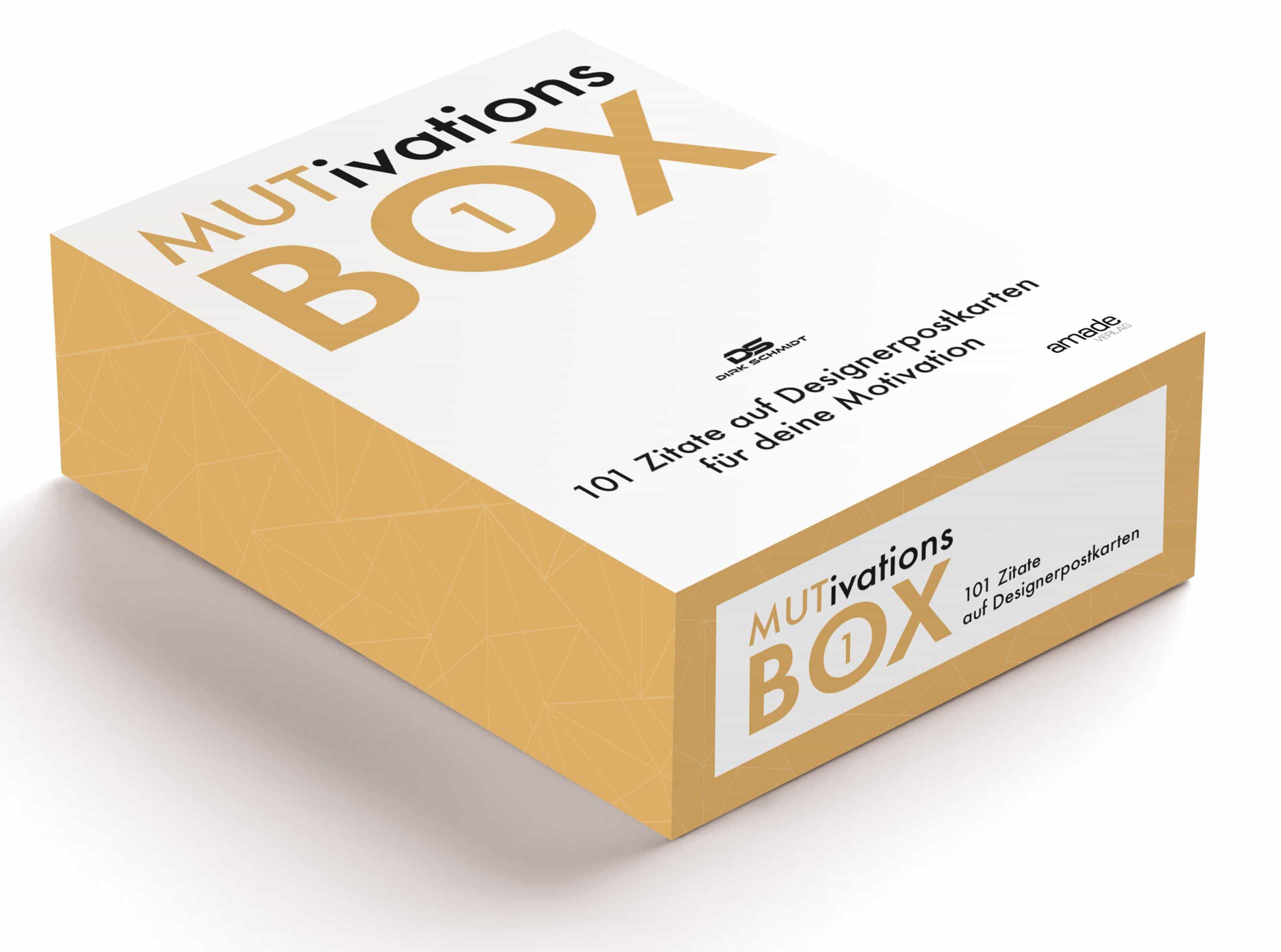 Ich habe die MUTivationsbox von Dirk Schmidt bekommen und seitdem auf meinem Schreibtisch stehen. Ich gehe die Karten immer mal wieder durch und der Spruch, der mich jeweils am meisten anspricht, bleibt für eine Weile ganz oben. So sehe ich immer wieder zwischendurch ein bisschen Motivation. 🙂 Die Sprüche und Zitate sind super! 🙂